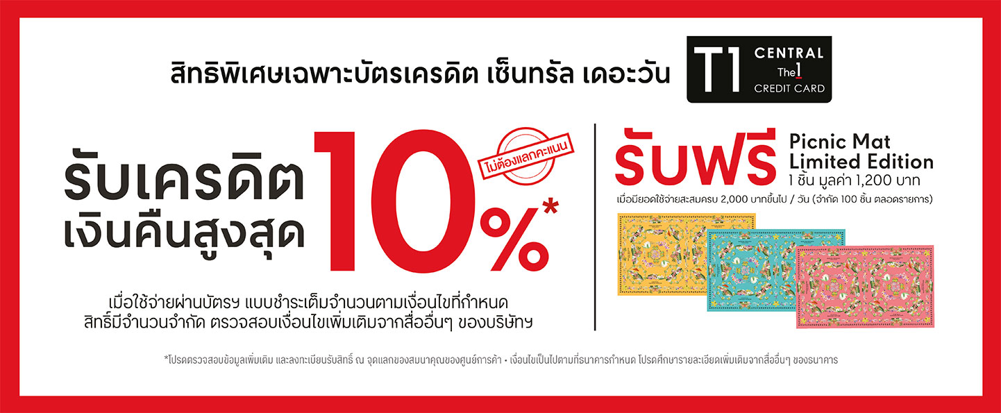 • บัตรเครดิต เซ็นทรัล เดอะวัน รับเครดิตเงินคืนสูงสุด 10% โดยไม่ต้องแลกคะแนน เมื่อมียอดชำระเต็มจำนวนครบตามกำหนด หมวดช้อปปิ้ง เมื่อมียอดชำระแบบเต็มจำนวน 3,000 - 9,999 บาท/เซลส์สลิป รับเครดิตเงินคืน 100 บาท เมื่อมียอดชำระแบบเต็มจำนวน 10,000 บาทขึ้นไป/เซลส์สลิป รับเครดิตเงินคืน 500 บาท (จำกัดเครดิตเงินคืนสูงสุด 500 บาท/เซลส์สลิป/หมายเลขบัญชีบัตรหลัก ตลอดรายการ) หมวดร้านอาหาร เมื่อมียอดชำระแบบเต็มจำนวน 1,000 บาทขึ้นไป/เซลส์สลิป รับเครดิตเงินคืน 100 บาท (จำกัดเครดิตเงินคืนสูงสุด 100 บาท/เซลส์สลิป และ จำกัดเครดิตเงินคืนสูงสุด 200 บาท/หมายเลขบัญชีบัตรหลัก ตลอดรายการ จำกัดสิทธิ์จำนวน 300 สิทธิ์ ตลอดรายการ) ระหว่างวันที่ 30 มี.ค. 67 – 19 พ.ค. 67